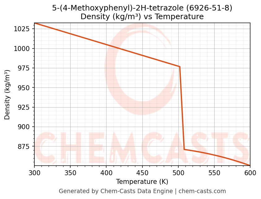 This page presents the temperature-dependent thermodynamic and transport properties of 5-(4-Methoxyphenyl)-2H-tetrazole (CAS 6926-51-8) calculated at a constant pressure of 1 atm (101325 Pa) over the temperature range 250-500 K.