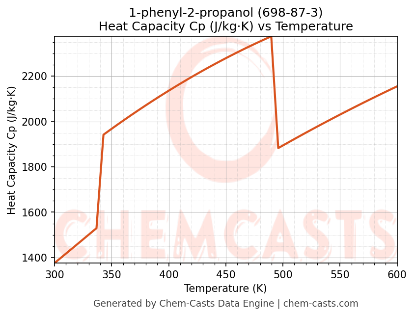 - Specific heat capacity (Cp) indicates the amount of energy required to raise the temperature of 1-phenyl-2-propanol and is critical for energy balance and heat-exchanger design.