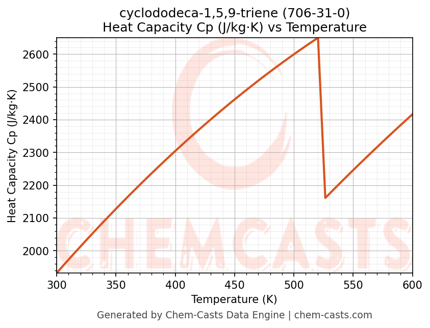 - Specific heat capacity (Cp) indicates the amount of energy required to raise the temperature of cyclododeca-1,5,9-triene and is critical for energy balance and heat-exchanger design.