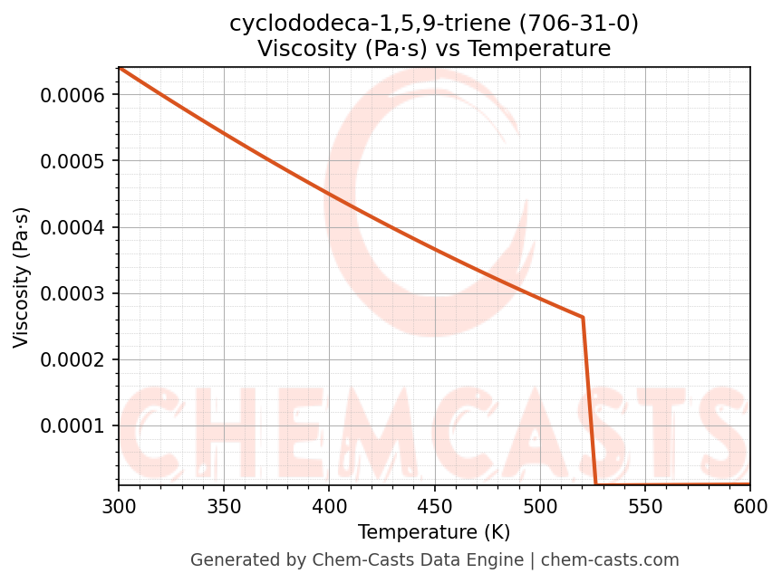This page presents the temperature-dependent thermodynamic and transport properties of cyclododeca-1,5,9-triene (CAS 706-31-0) calculated at a constant pressure of 1 atm (101325 Pa) over the temperature range 250-500 K.