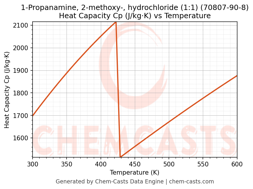- Specific heat capacity (Cp) indicates the amount of energy required to raise the temperature of 1-Propanamine, 2-methoxy-, hydrochloride (1:1) and is critical for energy balance and heat-exchanger design.