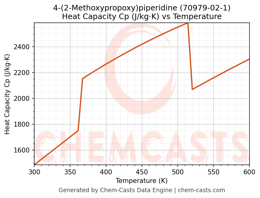 - Specific heat capacity (Cp) indicates the amount of energy required to raise the temperature of 4-(2-Methoxypropoxy)piperidine and is critical for energy balance and heat-exchanger design.