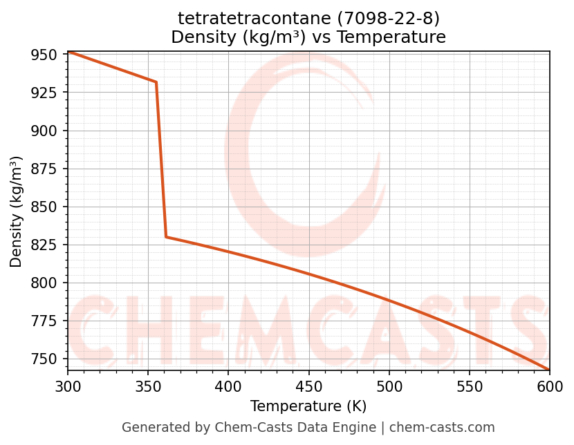 This page presents the temperature-dependent thermodynamic and transport properties of tetratetracontane (CAS 7098-22-8) calculated at a constant pressure of 1 atm (101325 Pa) over the temperature range 250-500 K.