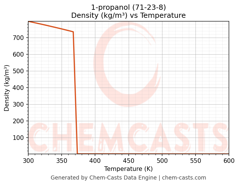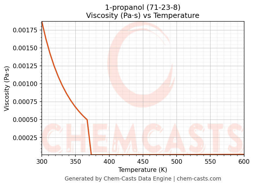 This page presents the temperature-dependent thermodynamic and transport properties of 1-propanol (CAS 71-23-8) calculated at a constant pressure of 1 atm (101325 Pa) over the temperature range 250-500 K.