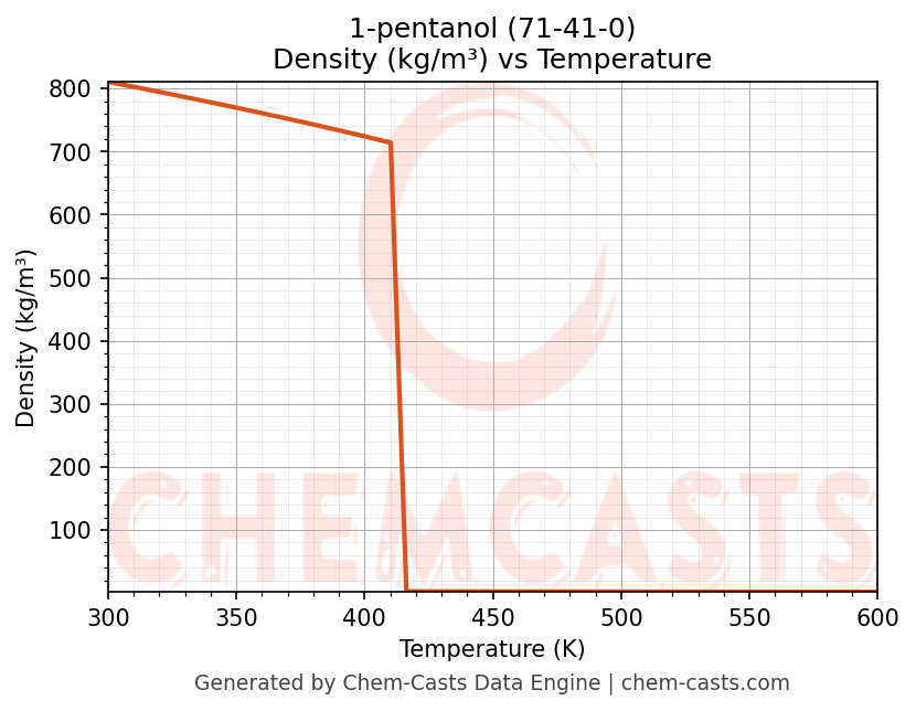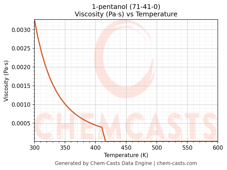 This page presents the temperature-dependent thermodynamic and transport properties of 1-pentanol (CAS 71-41-0) calculated at a constant pressure of 1 atm (101325 Pa) over the temperature range 250-500 K.