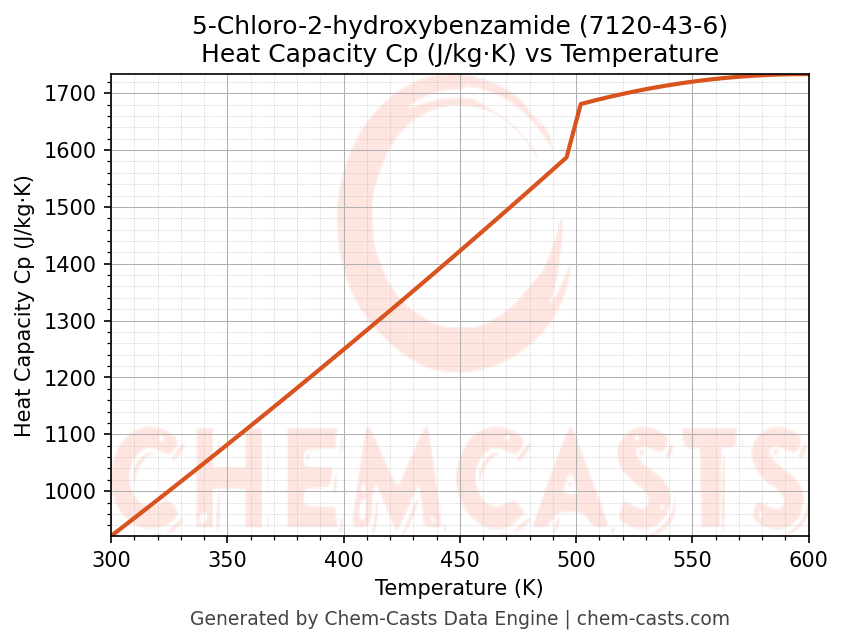 - Specific heat capacity (Cp) indicates the amount of energy required to raise the temperature of 5-Chloro-2-hydroxybenzamide and is critical for energy balance and heat-exchanger design.