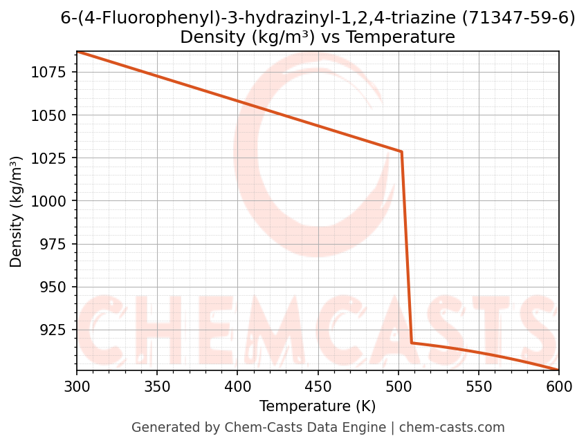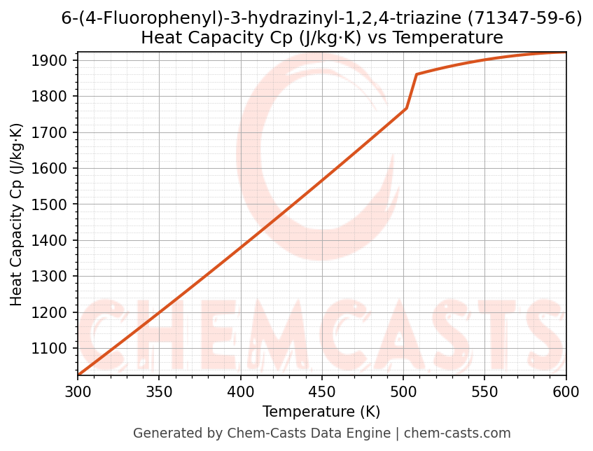 This page presents the temperature-dependent thermodynamic and transport properties of 6-(4-Fluorophenyl)-3-hydrazinyl-1,2,4-triazine (CAS 71347-59-6) calculated at a constant pressure of 1 atm (101325 Pa) over the temperature range 250-500 K.