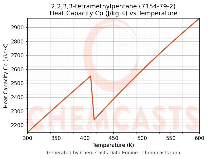 - Specific heat capacity (Cp) indicates the amount of energy required to raise the temperature of 2,2,3,3-tetramethylpentane and is critical for energy balance and heat-exchanger design.