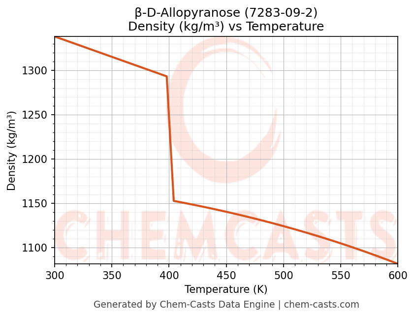 This page presents the temperature-dependent thermodynamic and transport properties of β-D-Allopyranose (CAS 7283-09-2) calculated at a constant pressure of 1 atm (101325 Pa) over the temperature range 250-500 K.