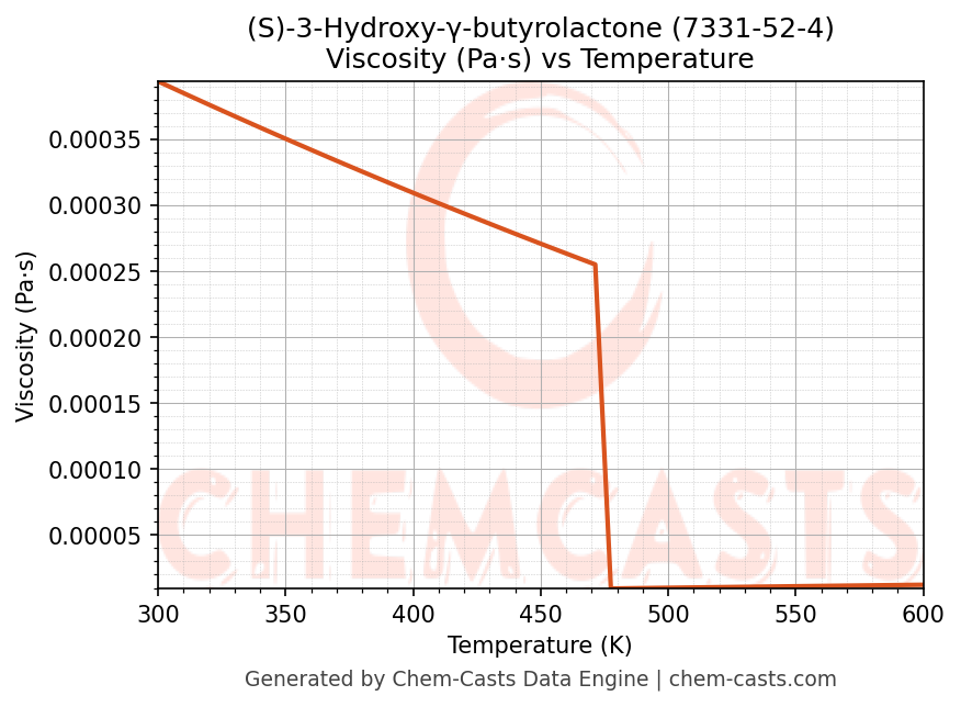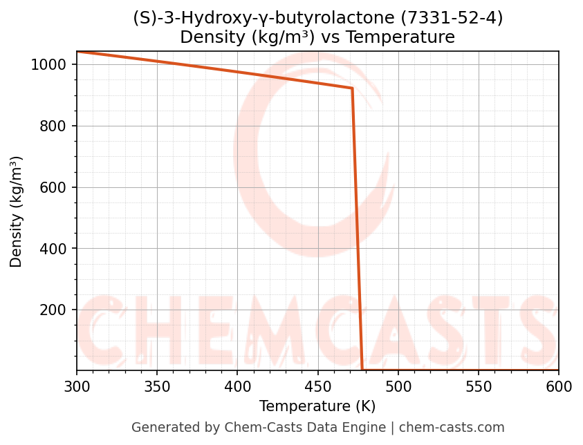 This page presents the temperature-dependent thermodynamic and transport properties of (S)-3-Hydroxy-γ-butyrolactone (CAS 7331-52-4) calculated at a constant pressure of 1 atm (101325 Pa) over the temperature range 250-500 K.