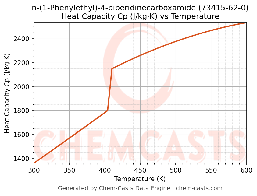 - Specific heat capacity (Cp) indicates the amount of energy required to raise the temperature of n-(1-Phenylethyl)-4-piperidinecarboxamide and is critical for energy balance and heat-exchanger design.