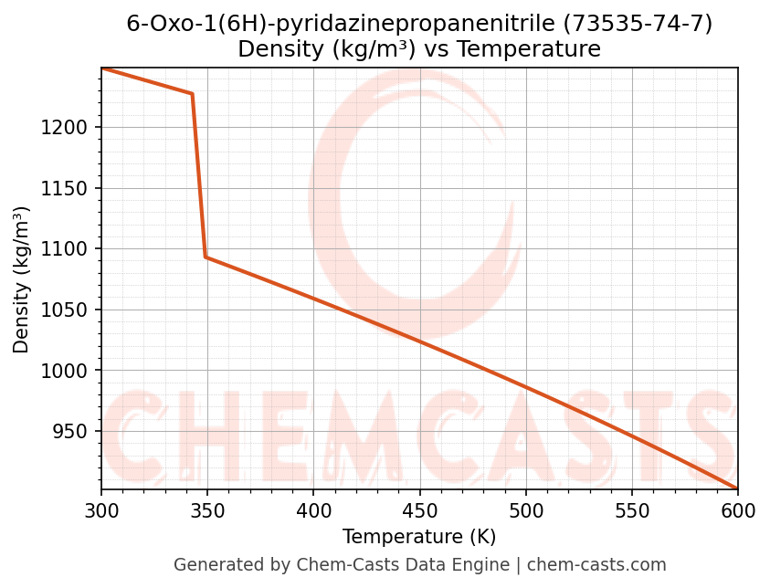 This page presents the temperature-dependent thermodynamic and transport properties of 6-Oxo-1(6H)-pyridazinepropanenitrile (CAS 73535-74-7) calculated at a constant pressure of 1 atm (101325 Pa) over the temperature range 250-500 K.