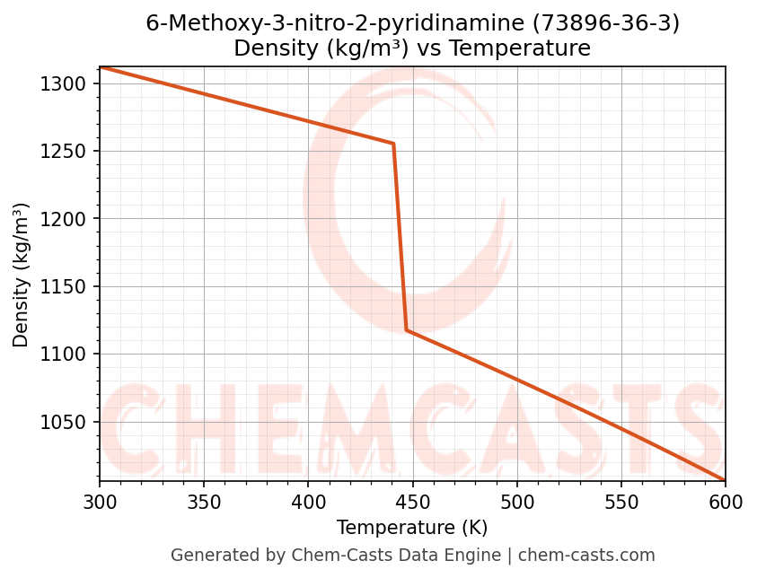 This page presents the temperature-dependent thermodynamic and transport properties of 6-Methoxy-3-nitro-2-pyridinamine (CAS 73896-36-3) calculated at a constant pressure of 1 atm (101325 Pa) over the temperature range 250-500 K.