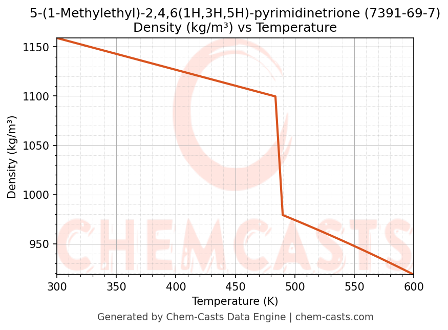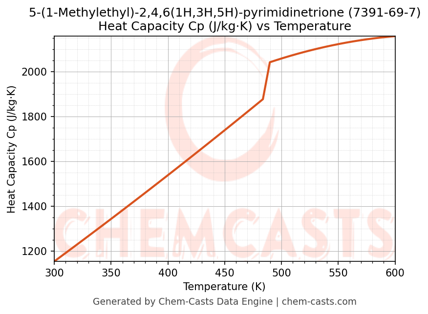 - Specific heat capacity (Cp) indicates the amount of energy required to raise the temperature of 5-(1-Methylethyl)-2,4,6(1H,3H,5H)-pyrimidinetrione and is critical for energy balance and heat-exchanger design.