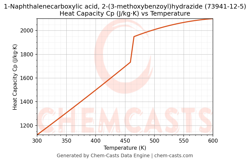 - Specific heat capacity (Cp) indicates the amount of energy required to raise the temperature of 1-Naphthalenecarboxylic acid, 2-(3-methoxybenzoyl)hydrazide and is critical for energy balance and heat-exchanger design.