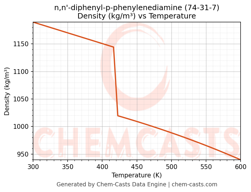 This page presents the temperature-dependent thermodynamic and transport properties of n,n'-diphenyl-p-phenylenediamine (CAS 74-31-7) calculated at a constant pressure of 1 atm (101325 Pa) over the temperature range 250-500 K.