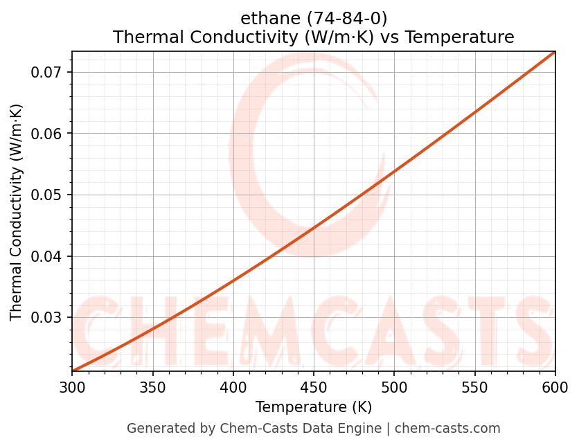 This page presents the temperature-dependent thermodynamic and transport properties of ethane (CAS 74-84-0) calculated at a constant pressure of 1 atm (101325 Pa) over the temperature range 250-500 K.