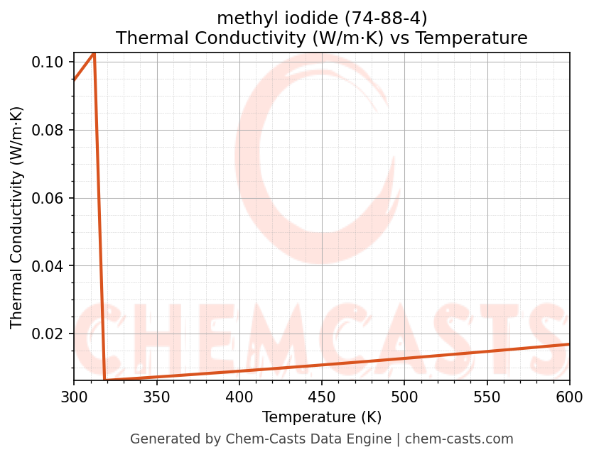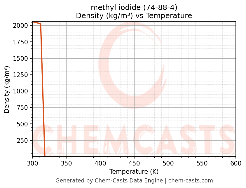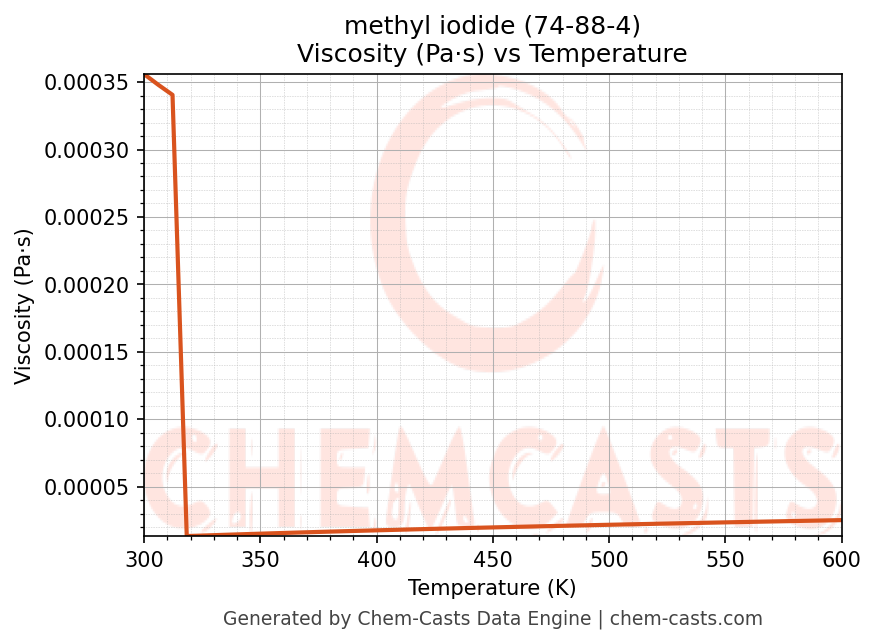 This page presents the temperature-dependent thermodynamic and transport properties of methyl iodide (CAS 74-88-4) calculated at a constant pressure of 1 atm (101325 Pa) over the temperature range 250-500 K.