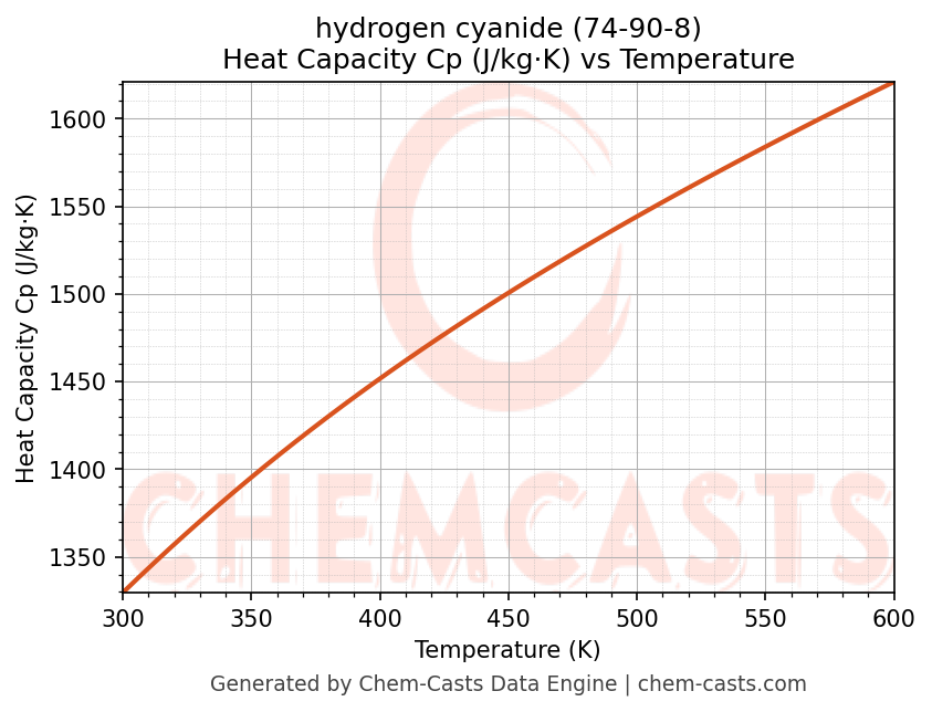 - Specific heat capacity (Cp) indicates the amount of energy required to raise the temperature of hydrogen cyanide and is critical for energy balance and heat-exchanger design.