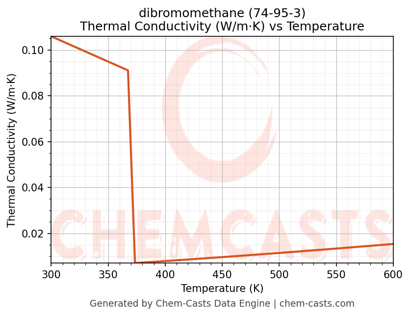 This page presents the temperature-dependent thermodynamic and transport properties of dibromomethane (CAS 74-95-3) calculated at a constant pressure of 1 atm (101325 Pa) over the temperature range 250-500 K.