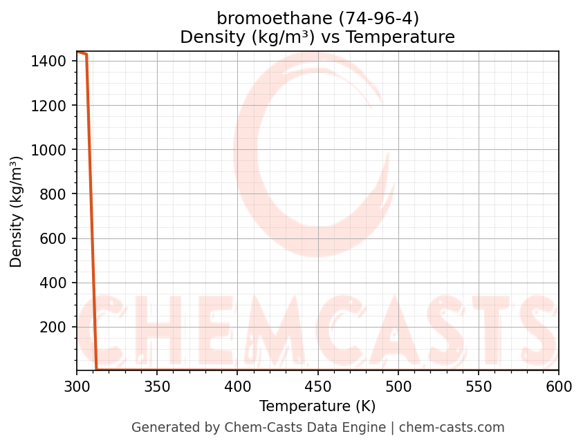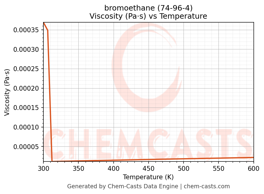 This page presents the temperature-dependent thermodynamic and transport properties of bromoethane (CAS 74-96-4) calculated at a constant pressure of 1 atm (101325 Pa) over the temperature range 250-500 K.