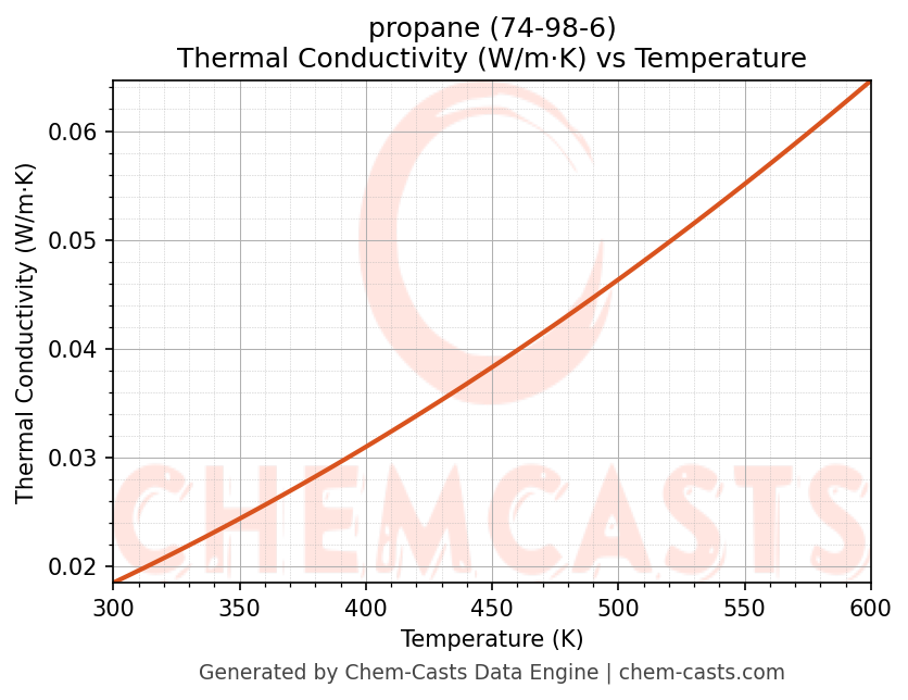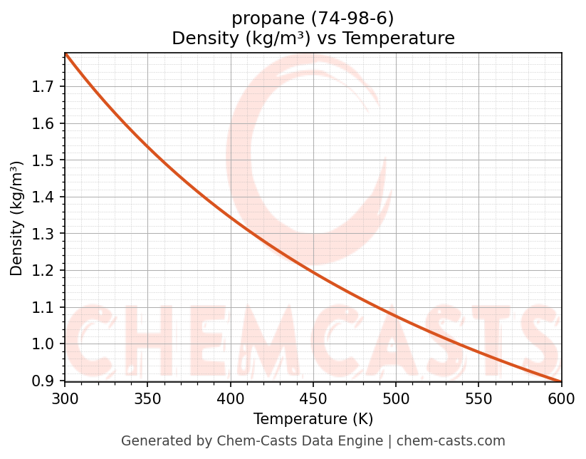 This page presents the temperature-dependent thermodynamic and transport properties of propane (CAS 74-98-6) calculated at a constant pressure of 1 atm (101325 Pa) over the temperature range 250-500 K.