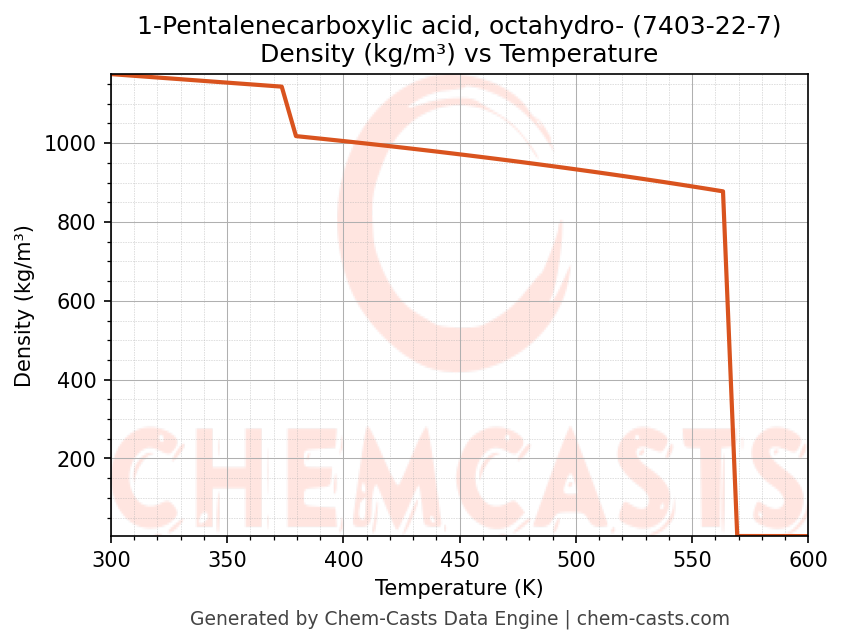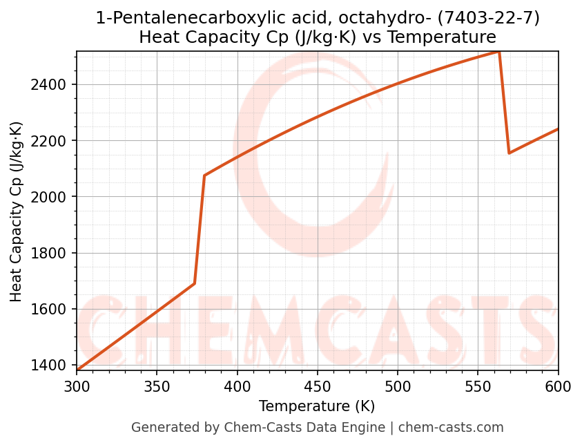 - Specific heat capacity (Cp) indicates the amount of energy required to raise the temperature of 1-Pentalenecarboxylic acid, octahydro- and is critical for energy balance and heat-exchanger design.