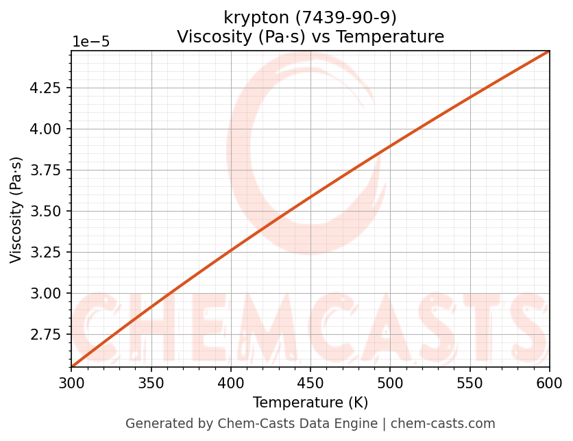 This page presents the temperature-dependent thermodynamic and transport properties of krypton (CAS 7439-90-9) calculated at a constant pressure of 1 atm (101325 Pa) over the temperature range 250-500 K.