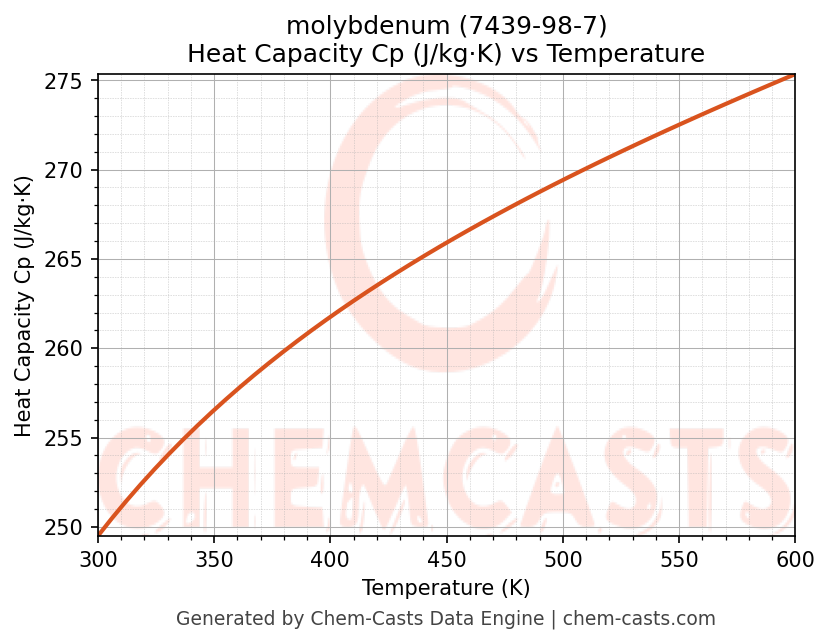 - Specific heat capacity (Cp) indicates the amount of energy required to raise the temperature of molybdenum and is critical for energy balance and heat-exchanger design.