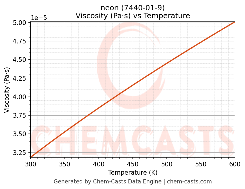 This page presents the temperature-dependent thermodynamic and transport properties of neon (CAS 7440-01-9) calculated at a constant pressure of 1 atm (101325 Pa) over the temperature range 250-500 K.