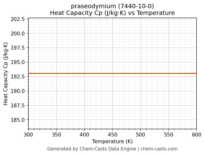 - Specific heat capacity (Cp) indicates the amount of energy required to raise the temperature of praseodymium and is critical for energy balance and heat-exchanger design.