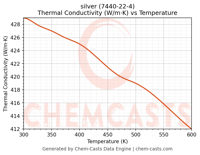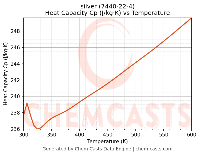 - Specific heat capacity (Cp) indicates the amount of energy required to raise the temperature of silver and is critical for energy balance and heat-exchanger design.