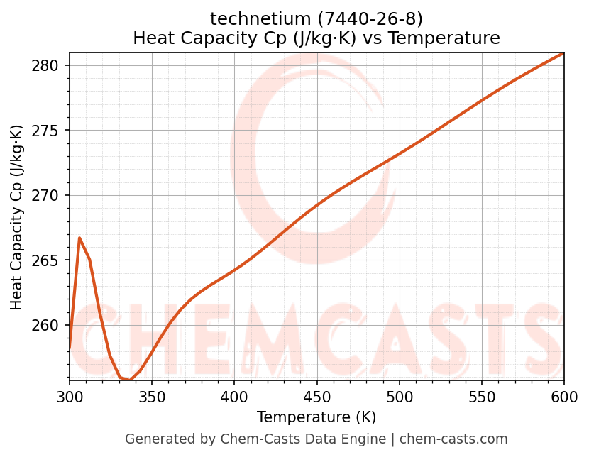 - Specific heat capacity (Cp) indicates the amount of energy required to raise the temperature of technetium and is critical for energy balance and heat-exchanger design.