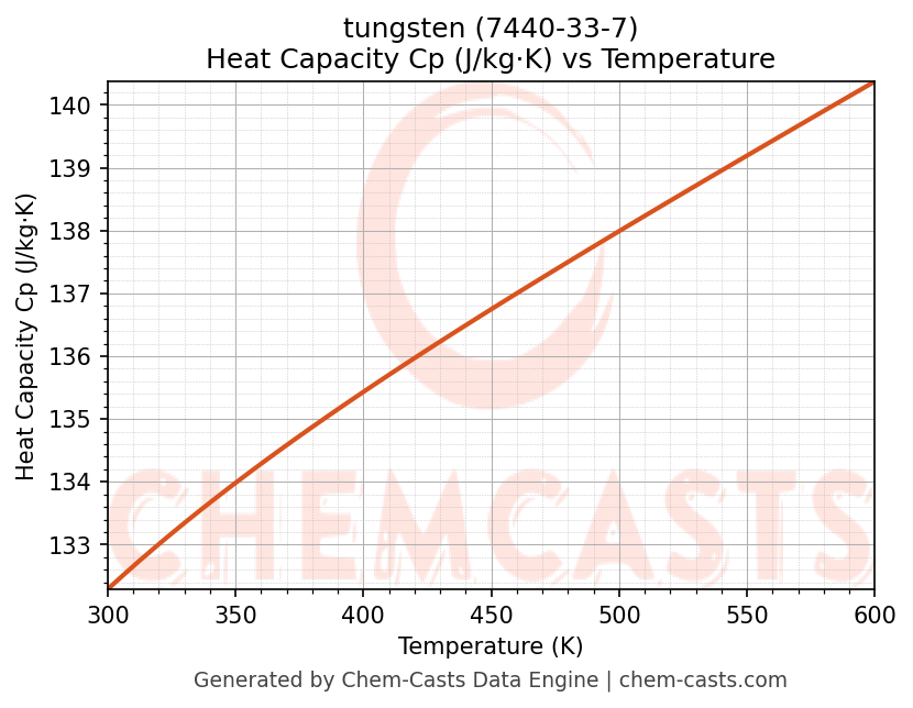 - Specific heat capacity (Cp) indicates the amount of energy required to raise the temperature of tungsten and is critical for energy balance and heat-exchanger design.