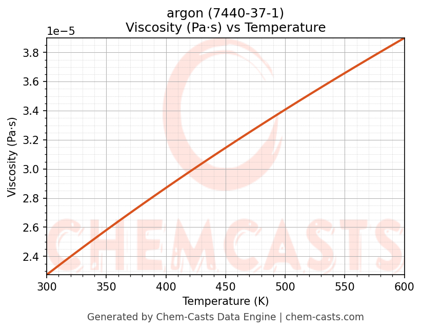 This page presents the temperature-dependent thermodynamic and transport properties of argon (CAS 7440-37-1) calculated at a constant pressure of 1 atm (101325 Pa) over the temperature range 250-500 K.