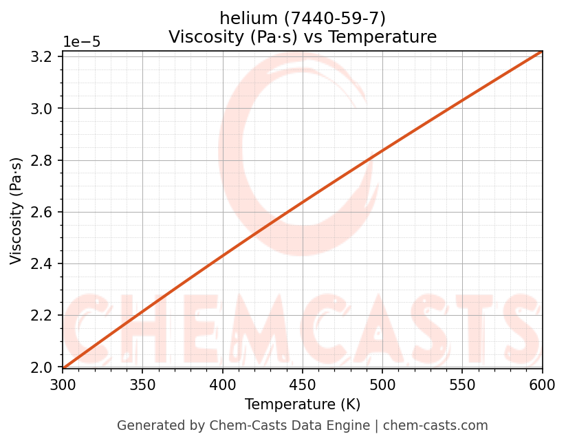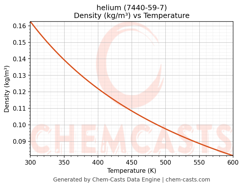 This page presents the temperature-dependent thermodynamic and transport properties of helium (CAS 7440-59-7) calculated at a constant pressure of 1 atm (101325 Pa) over the temperature range 250-500 K.