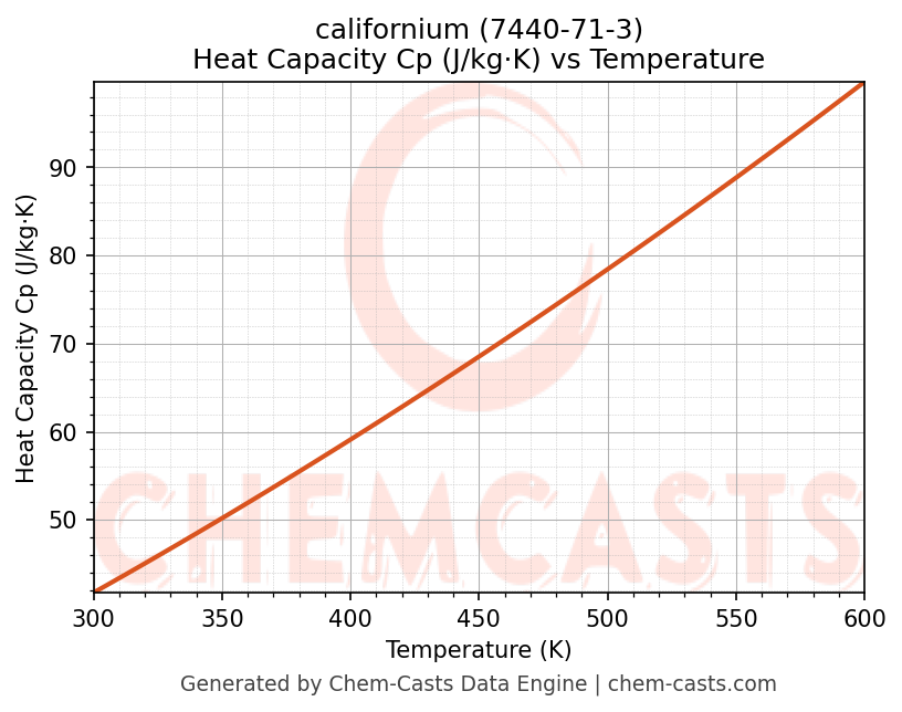 - Specific heat capacity (Cp) indicates the amount of energy required to raise the temperature of californium and is critical for energy balance and heat-exchanger design.