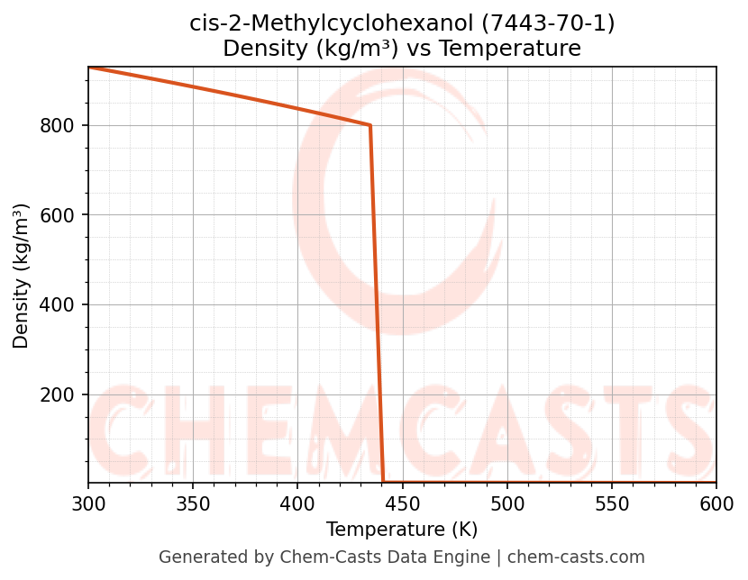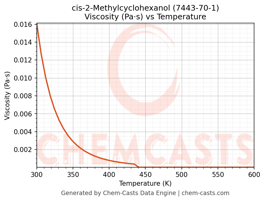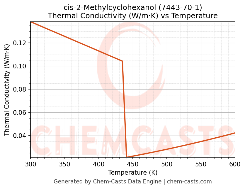 This page presents the temperature-dependent thermodynamic and transport properties of cis-2-Methylcyclohexanol (CAS 7443-70-1) calculated at a constant pressure of 1 atm (101325 Pa) over the temperature range 250-500 K.