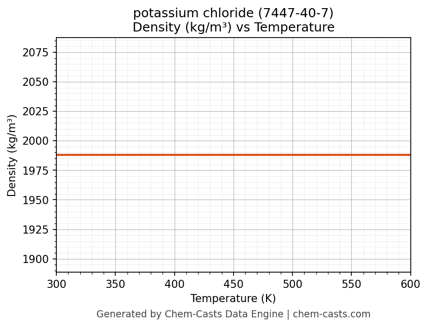 This page presents the temperature-dependent thermodynamic and transport properties of potassium chloride (CAS 7447-40-7) calculated at a constant pressure of 1 atm (101325 Pa) over the temperature range 250-500 K.