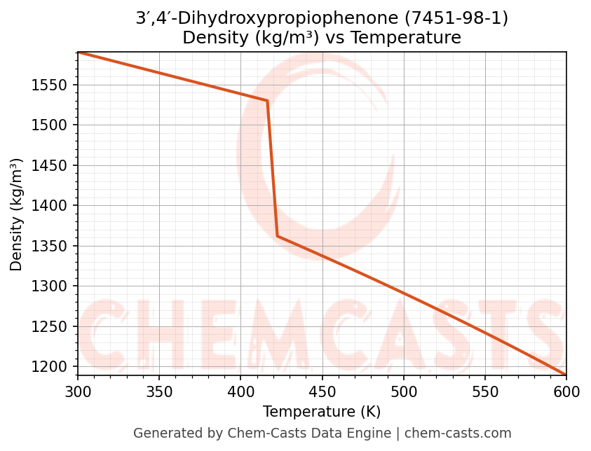 This page presents the temperature-dependent thermodynamic and transport properties of 3′,4′-Dihydroxypropiophenone (CAS 7451-98-1) calculated at a constant pressure of 1 atm (101325 Pa) over the temperature range 250-500 K.