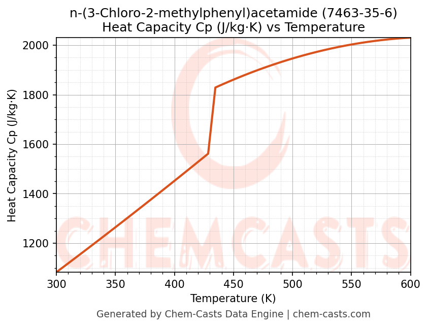 - Specific heat capacity (Cp) indicates the amount of energy required to raise the temperature of n-(3-Chloro-2-methylphenyl)acetamide and is critical for energy balance and heat-exchanger design.