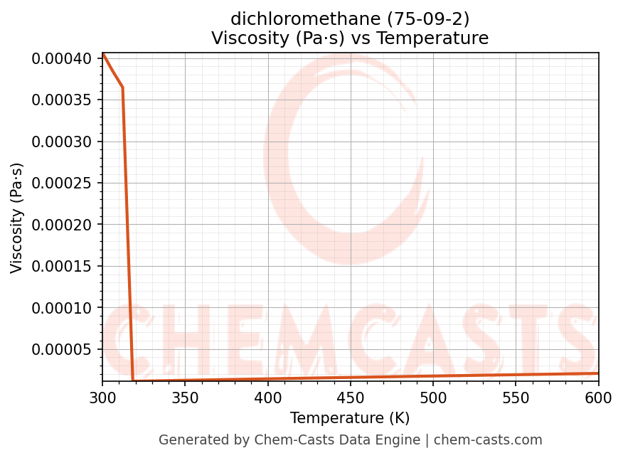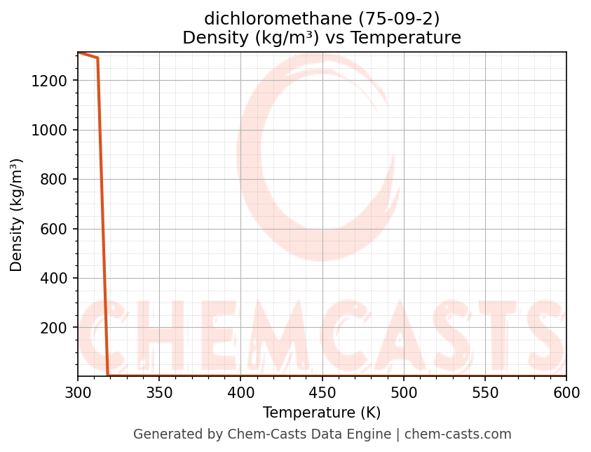 This page presents the temperature-dependent thermodynamic and transport properties of dichloromethane (CAS 75-09-2) calculated at a constant pressure of 1 atm (101325 Pa) over the temperature range 250-500 K.