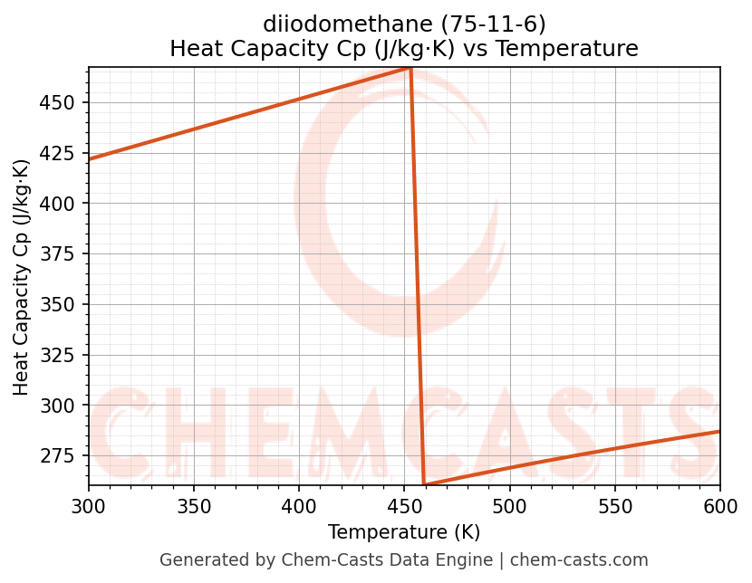 - Specific heat capacity (Cp) indicates the amount of energy required to raise the temperature of diiodomethane and is critical for energy balance and heat-exchanger design.