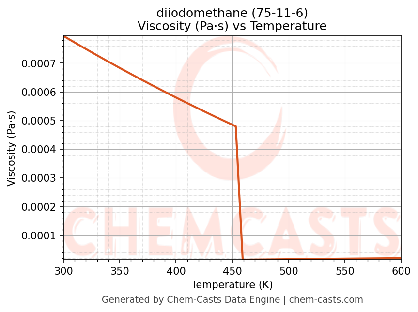 This page presents the temperature-dependent thermodynamic and transport properties of diiodomethane (CAS 75-11-6) calculated at a constant pressure of 1 atm (101325 Pa) over the temperature range 250-500 K.