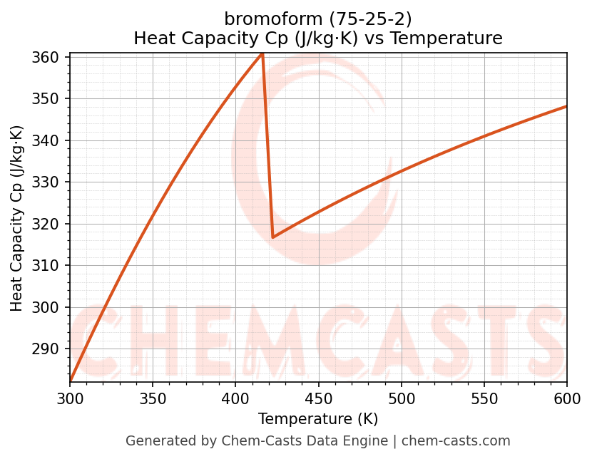 - Specific heat capacity (Cp) indicates the amount of energy required to raise the temperature of bromoform and is critical for energy balance and heat-exchanger design.