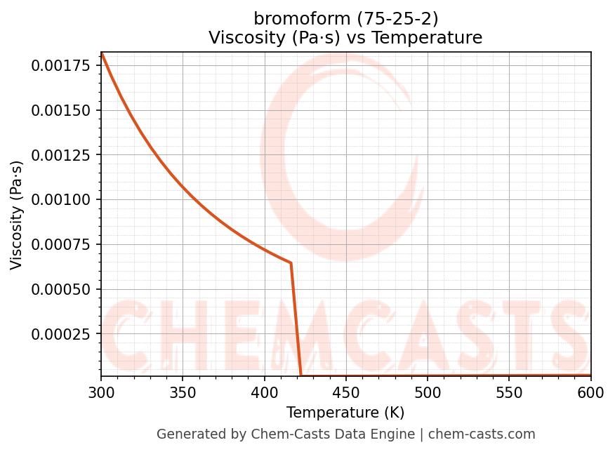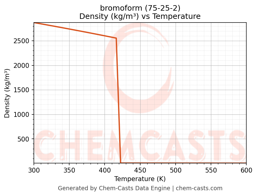 This page presents the temperature-dependent thermodynamic and transport properties of bromoform (CAS 75-25-2) calculated at a constant pressure of 1 atm (101325 Pa) over the temperature range 250-500 K.