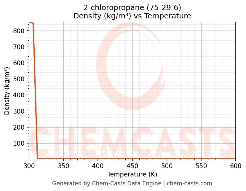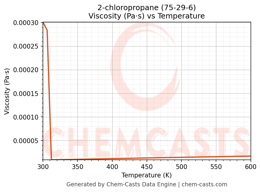 This page presents the temperature-dependent thermodynamic and transport properties of 2-chloropropane (CAS 75-29-6) calculated at a constant pressure of 1 atm (101325 Pa) over the temperature range 250-500 K.