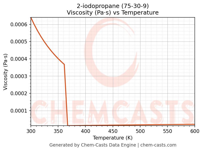 This page presents the temperature-dependent thermodynamic and transport properties of 2-iodopropane (CAS 75-30-9) calculated at a constant pressure of 1 atm (101325 Pa) over the temperature range 250-500 K.