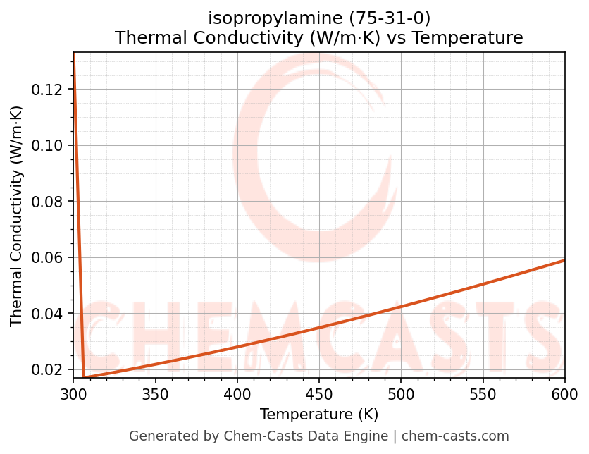 This page presents the temperature-dependent thermodynamic and transport properties of isopropylamine (CAS 75-31-0) calculated at a constant pressure of 1 atm (101325 Pa) over the temperature range 250-500 K.