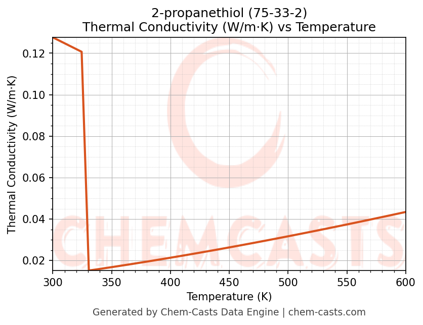 This page presents the temperature-dependent thermodynamic and transport properties of 2-propanethiol (CAS 75-33-2) calculated at a constant pressure of 1 atm (101325 Pa) over the temperature range 250-500 K.